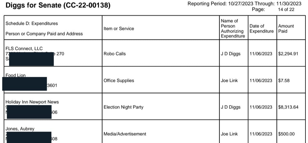 Diggs would go on to win his 2023 election by only 725 votes. From open source reporting from VPAP, Jones was paid over $5400 from Republican candiates for the 2023 elections.