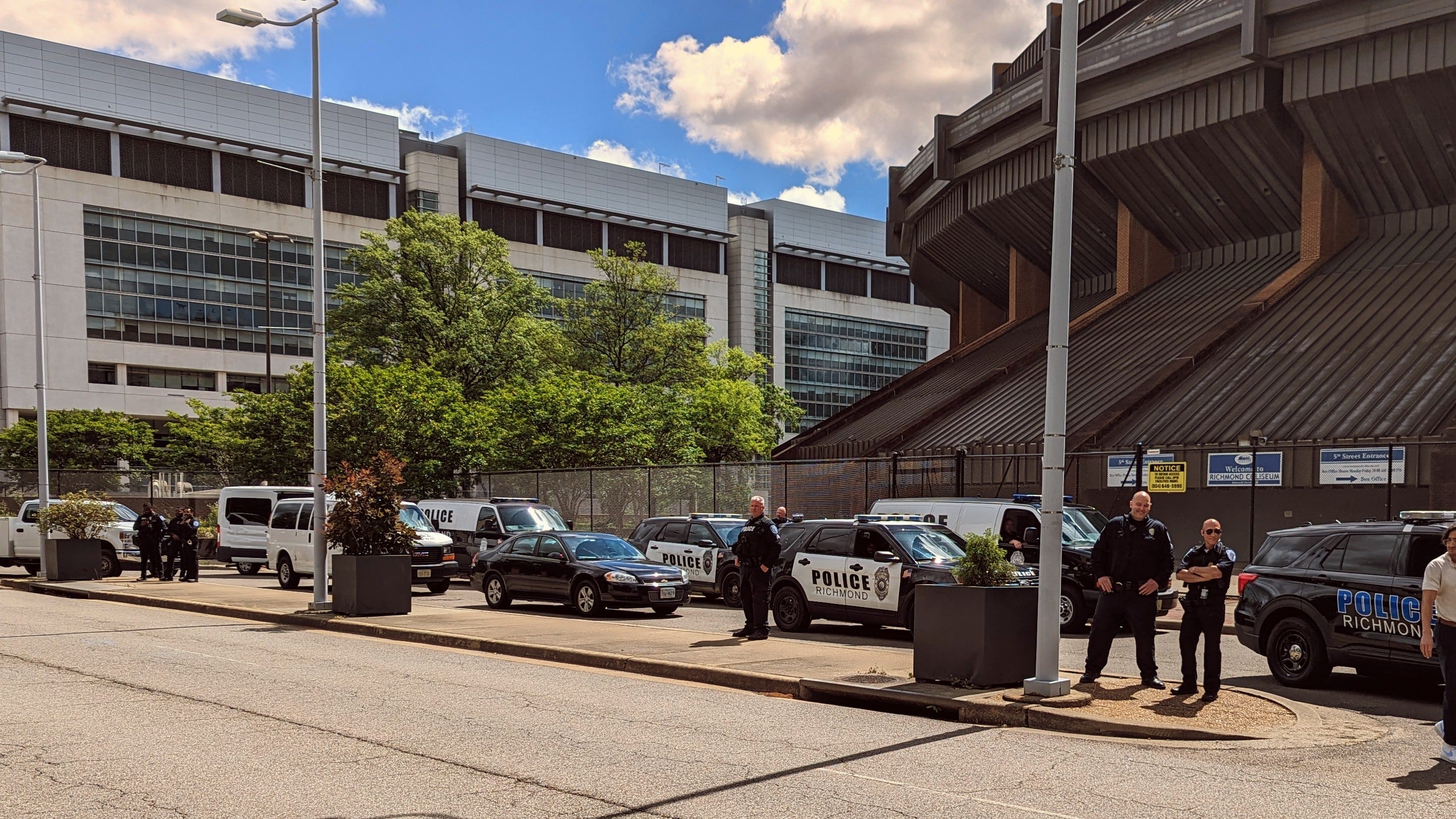 The students exited the convention center, passing signs on the doors indicating that reentry was prohibited. However, the display of security measures extended beyond the center, as across the street lay the old Richmond Coliseum site. Amidst the decaying structure, the new graduates saw a line of Richmond Police officers stationed beside their vehicles.