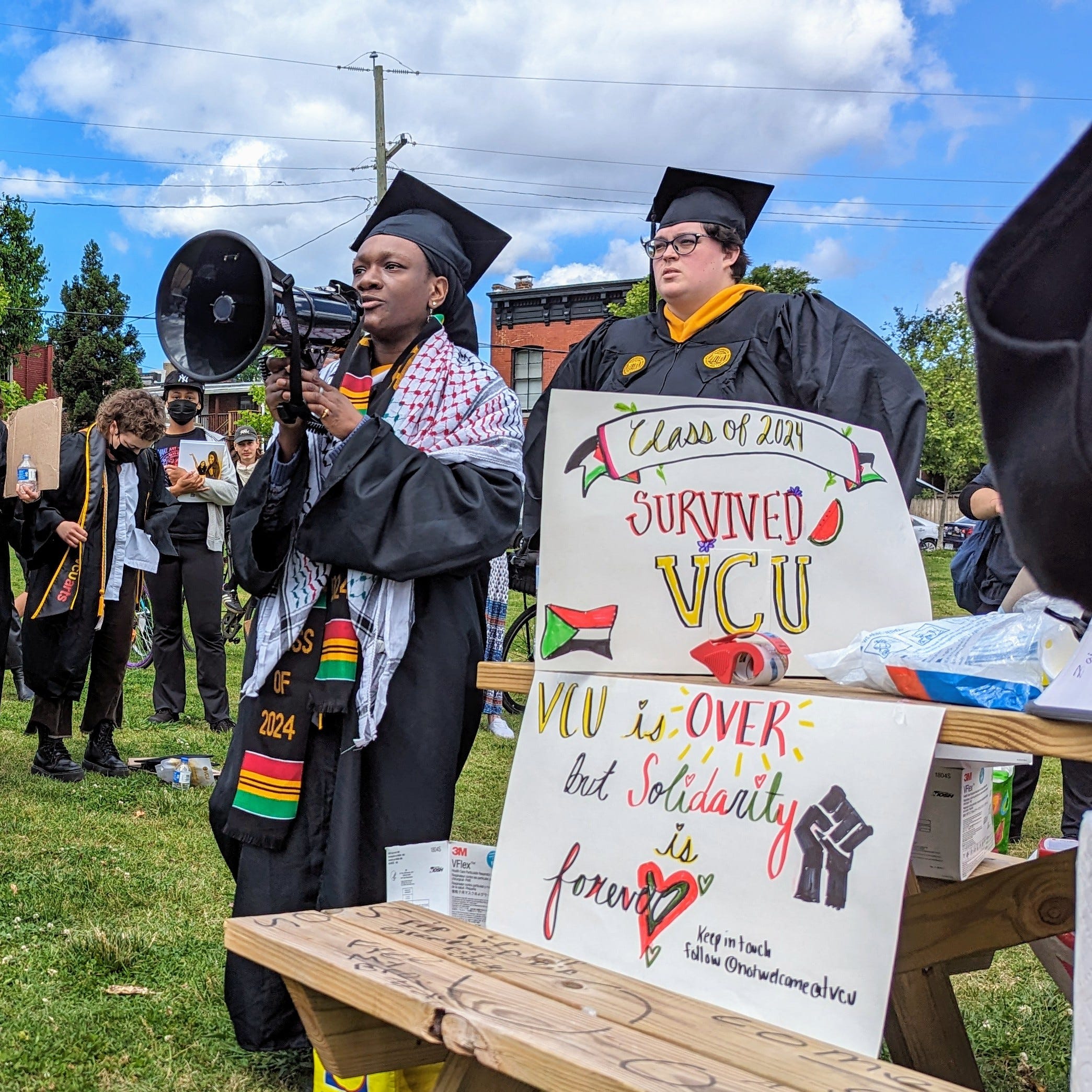The recent graduates of VCU did not merely linger in front of the convention center. As a procession of protesters appeared, the the class of 2024 joined in, adorned in their caps and gowns. They proceeded to Abner Clay Park, distancing themselves from the watchful eyes of law enforcement, to conduct their own commencement ceremony.