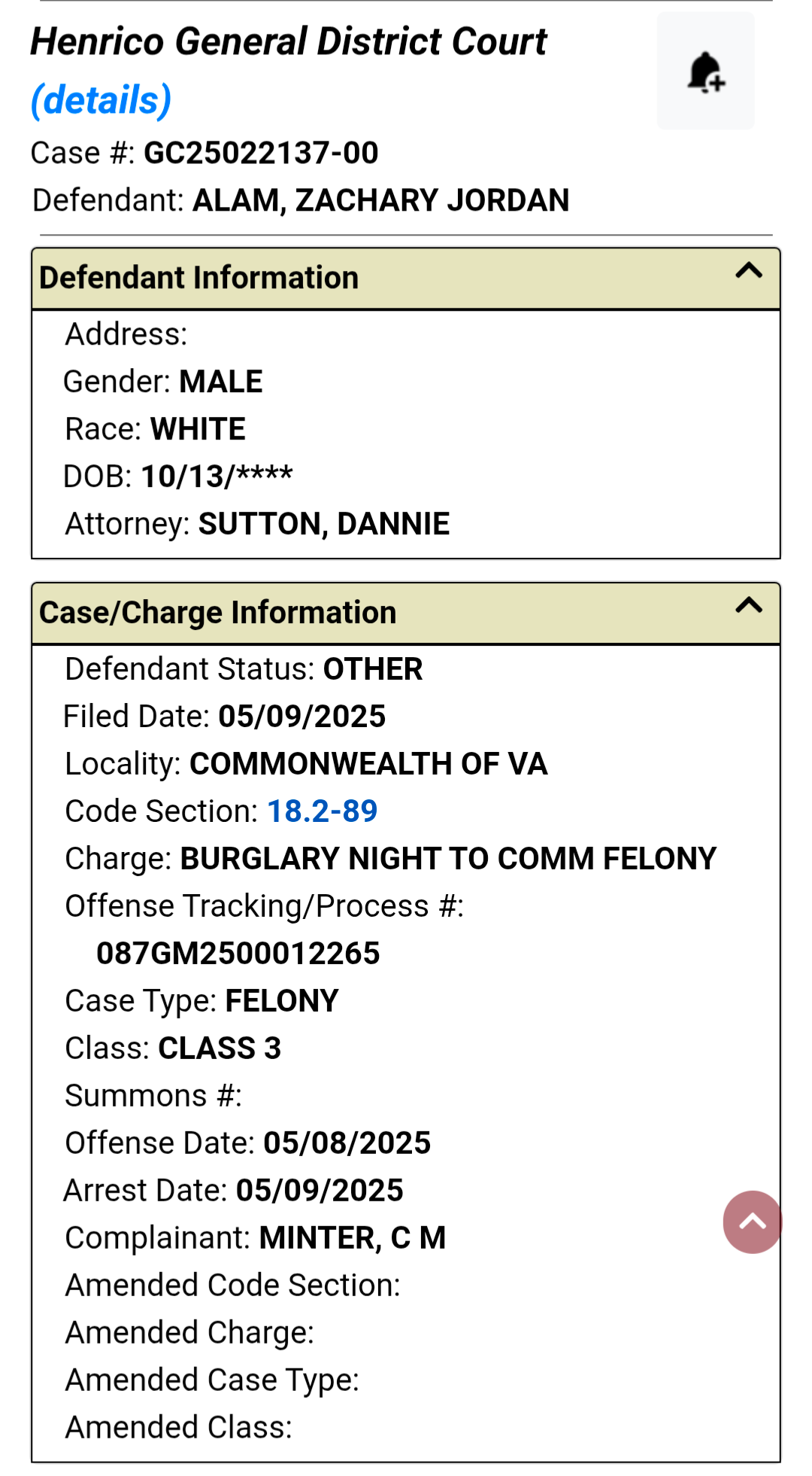 Oh May 9, Alam was arrested in Henrico County. Alam was arrested for burglary and destruction of property related to a May 8 incident in Varina. Alam's charge includes entering a house at night and carries a class 3 felony which carries a penalty of 5-20 years in prison. The location of the alleged burglary was 7 miles away from the J6er group house.
