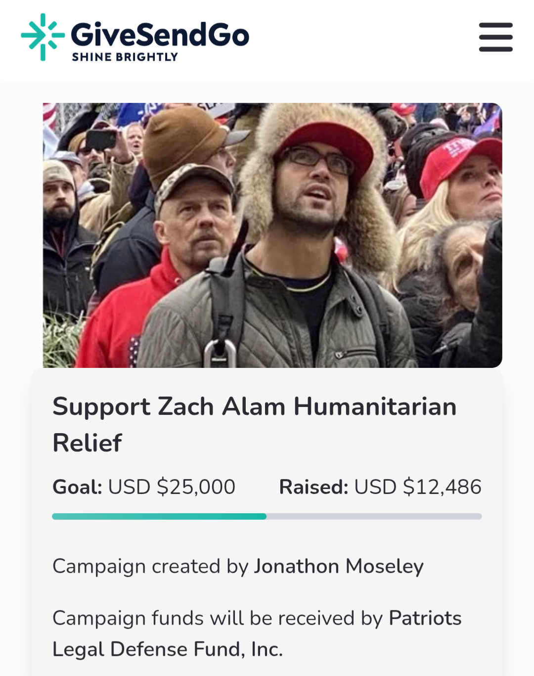 Jonathon Moseley and the Patriot Legal Defense Fund started the page for Alam. PLDF began as legal defense fund for Trump's staffers and allies as they were dealing with legal troubles prior to Trump's return to office.