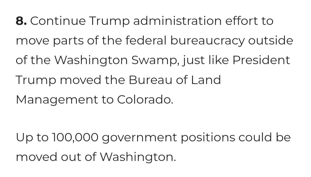In fact, moving federal jobs away from the Washington DC area is a campaign promise from Trump. From the campaign’s website and giving the BLM move to Colorado as an example, “Up to 100,000 government positions could be moved out of Washington.”