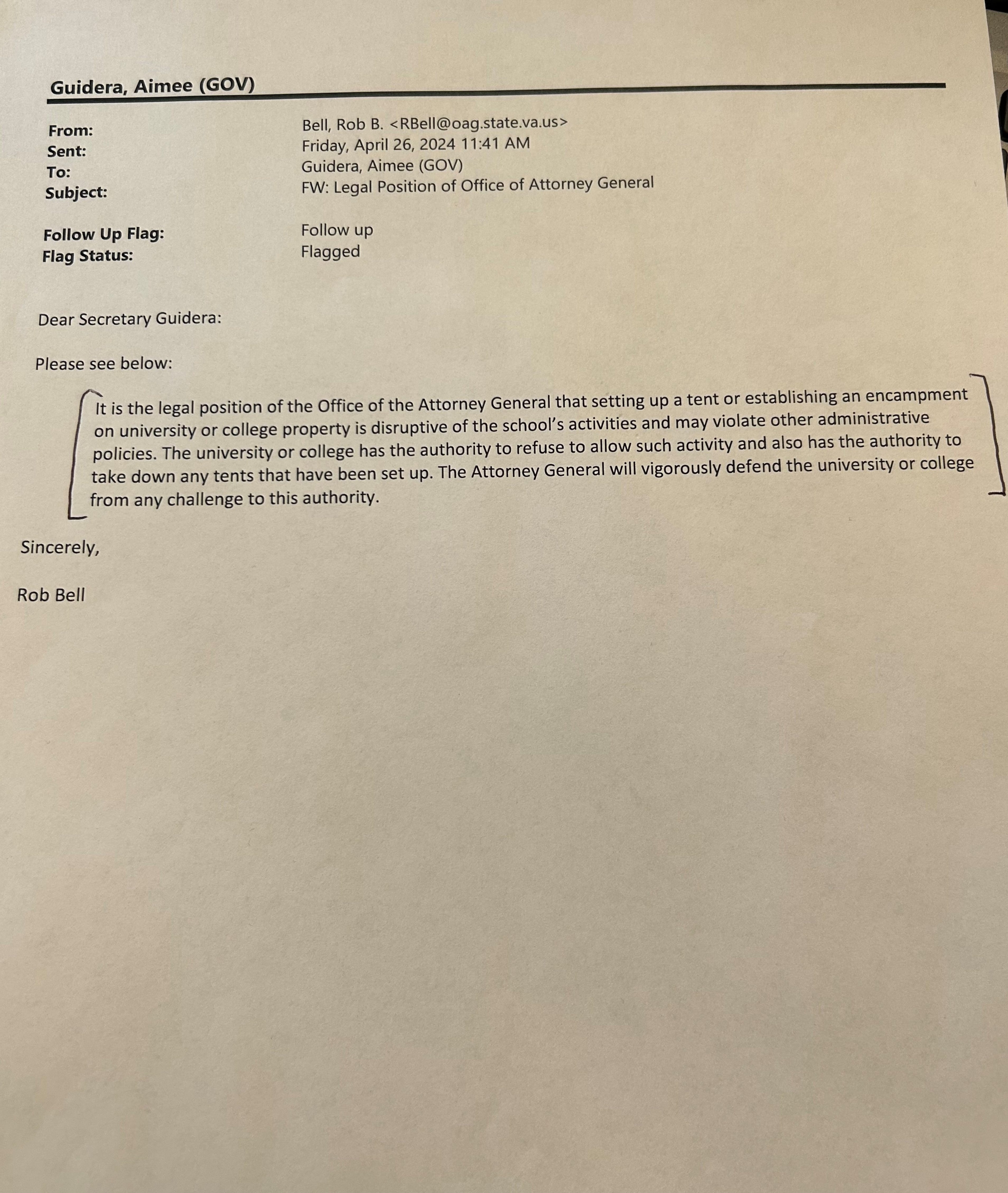 The Virginia Mercury had a FOIA a communication between Rob Bell of the Virginia Attorney General’s office and Aimee Guidera of the Virginia Education Department from April 26, the day before the first mass arrests at a Virginia college.